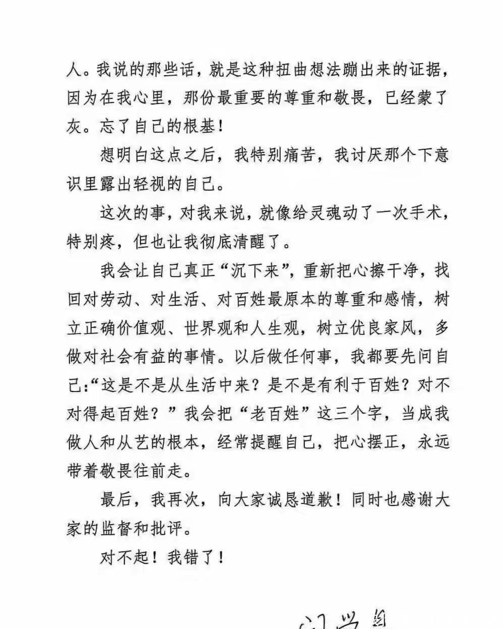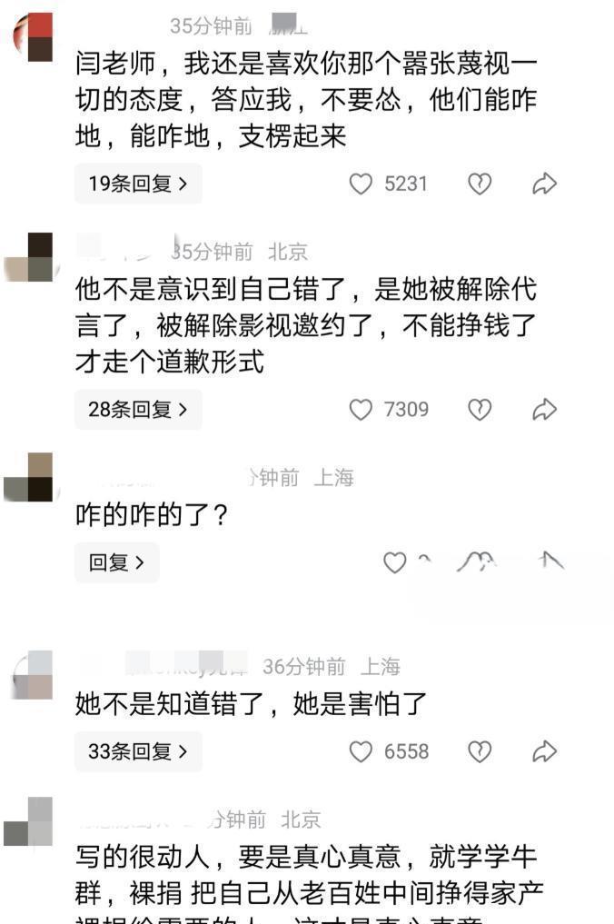 信里还提了自己的变化:从小在普通家庭长大,靠父老乡亲和生活烟火气才有了今天的艺术成就,可后来听多了掌声、见了大世面,慢慢就把这当成了优越感,忘了自己的根。"我把 ' 人民 '' 百姓 ' 当成了模糊的词,不是活生生的、和我连着根的人"—— 这句话算是把自己的问题说透了,也难怪之前会说出"儿子年入几十万不够花" 的话,在她心里,早就没了对普通人生活的敬畏。最后她承诺会"沉下来",重新找回对百姓的尊重,以后做任何事都先问自己"对得起百姓吗"。整个道歉信读下来,态度确实诚恳,没有找借口,也没有甩锅,算是难得的清醒。可网友并不买账。有人说"早干嘛去了?账号被禁、代言解约才道歉,太晚了",还有人翻出她之前怼网友"酸黄瓜" 的旧视频:"之前那么嚣张,现在知道错了?" 更有人直言"道歉要是有用,那之前的伤害算什么?"其实也难怪网友不原谅。从 12 月底直播哭穷,到 1 月初账号被禁、代言被解约,中间这么长时间,她一直不回应,直到舆论发酵到无法收拾,才出来道歉,这份"悔意" 确实少了点诚意。