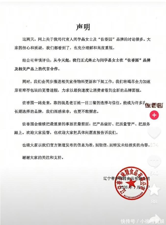 03道歉 + 辟谣双管齐下,闫学晶能翻身么现在闫学晶道歉了,儿子的争议也被中戏澄清了,可她的处境并没有好转。先看她的事业:代言的佐香园、统厨都解约了,统厨甚至因为印着她头像的包装没法用,直接全线停产,还要追讨损失;多平台账号被禁止关注,直播带货的路彻底断了;之前传的春晚邀约,现在也没了下文,估计没人敢冒风险请她。