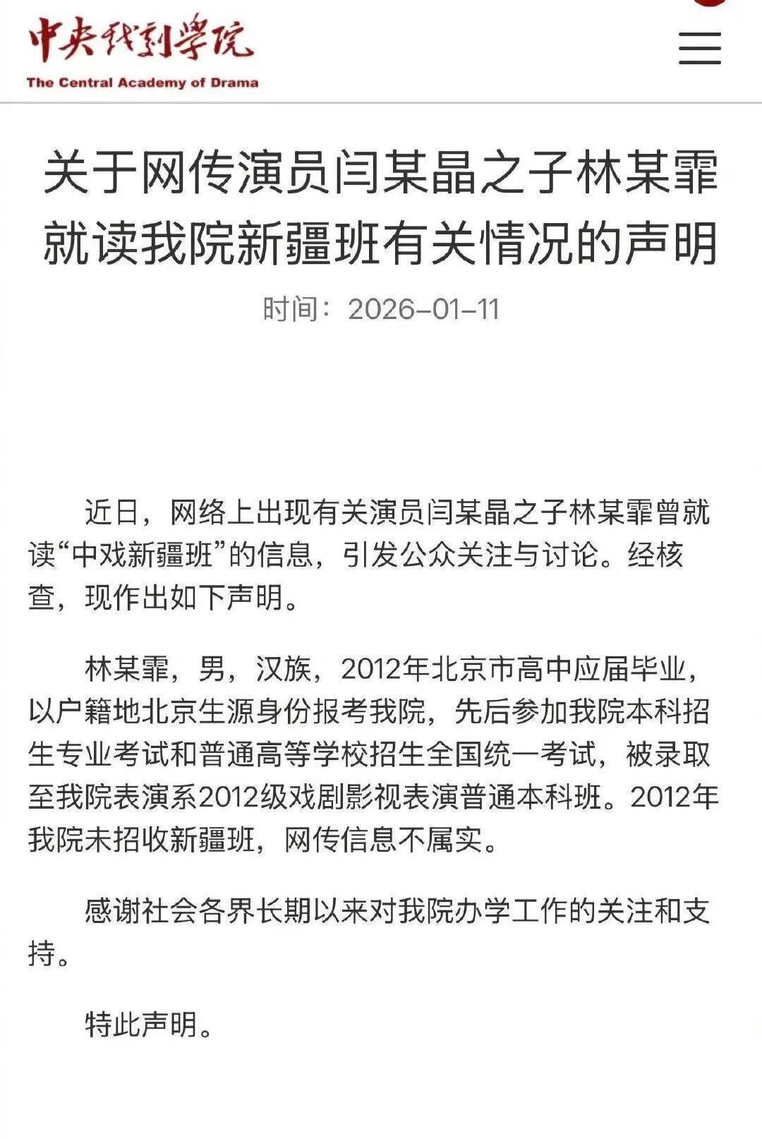2026 年 1 月 11 日晚上,内娱算是被闫学晶的两条消息炸醒了 —— 先是她在朋友圈发长文道歉,承认自己"习惯被捧忘了本",接着中央戏剧学院也跟着发声明,直接否认她儿子林傲霏读"新疆班" 的传言。两条消息凑在一起,应该可以暂时平息风波,但有的网友不太认同:"道歉早干嘛去了?"" 中戏辟谣为啥不晒录取成绩?"